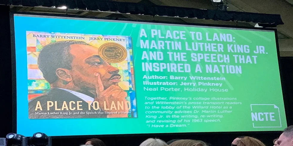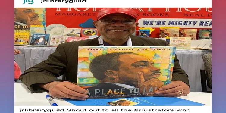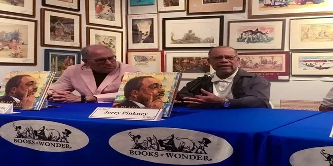 “[The] book, illustrated with enormous heart and rich textures by Jerry Pinkney, presents Dr. King’s inspiring words as part of an outsize pageant, featuring King, the crowds and others on the stage, including Mahalia Jackson, who urged King, ‘Tell them about the dream!'”